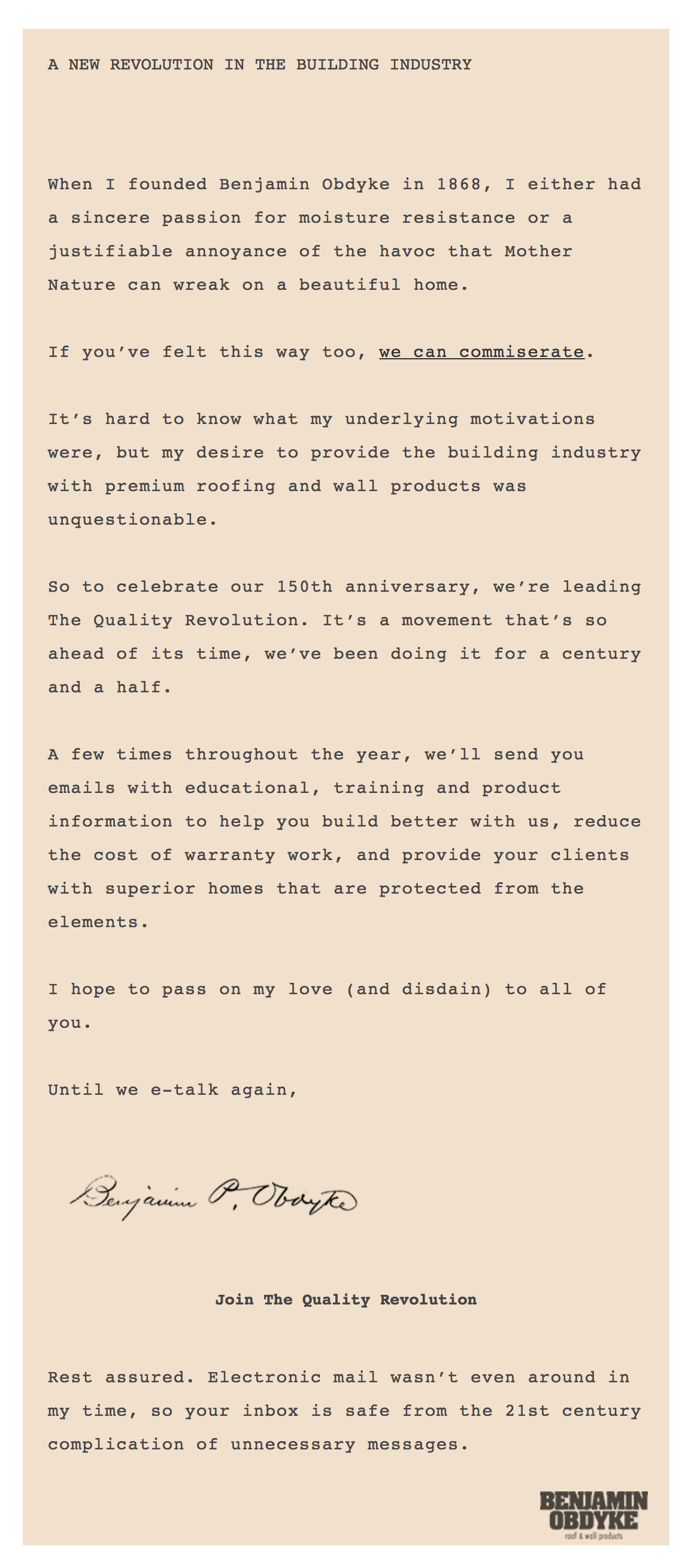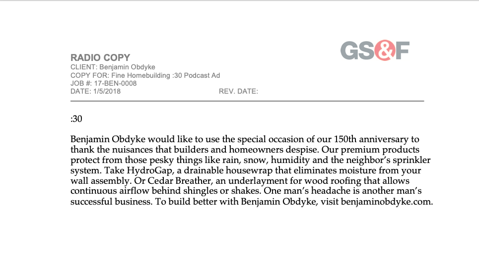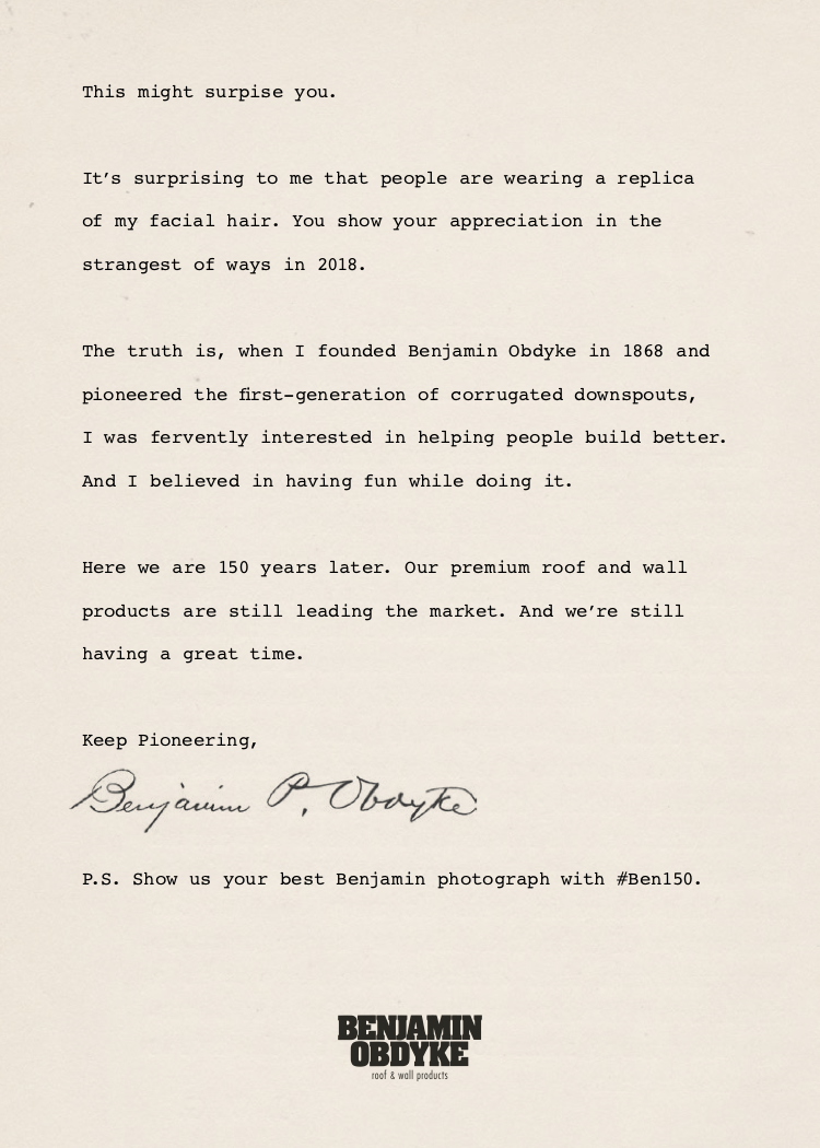Long-form copy is not dead. Neither is Benjamin Obdyke, the namesake for the company he founded in 1868. I made sure of that when I wrote the copy for this campaign as if he was still walking and talking today.